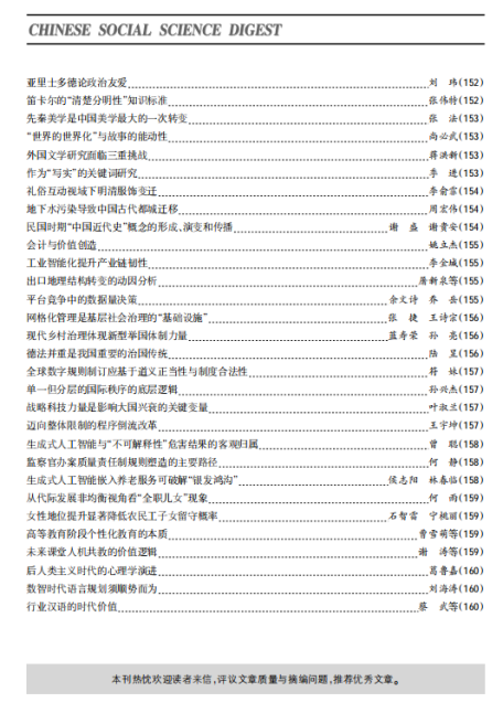 《中国社会科学文摘》由中国社会科学院主办,是大型综合性社会科学文摘期刊。它荟萃全国重要社科期刊精华,精选转载哲学社会科学各学科前沿成果,是了解中国学术动态和政策研究的重要窗口。《中国社会科学文摘》与《新华文摘》《高等学校文科学术文摘》和《人大复印报刊资料》并列我国人文社科领域最具权威性的二次文献转载平台,以筛选、转载高质量学术论文为主要功能,在学术界享有极高声誉。(审稿 刘卫民 金诗灿)