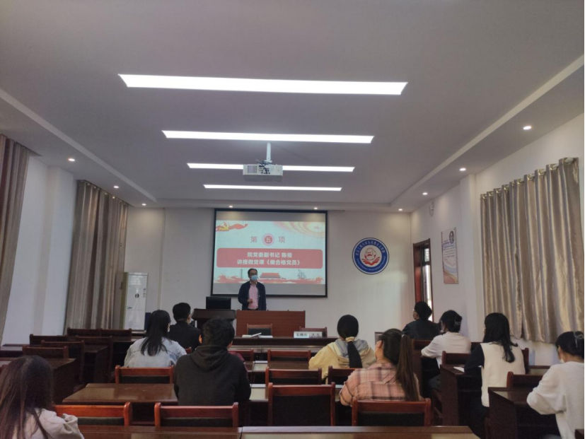 院党委副书记陈俊现场为大家讲授题为《如何做一名合格共产党员》的微党课。从旗帜鲜明讲政治、毫不动摇讲信仰、矢志不渝讲初心、大事难事讲担当、持之以恒讲廉洁五个方面与大家分享了个人的学习体会与实践感悟,希望全体党员珍惜党员身份,牢记党的初心,践行党的宗旨,担负党员责任,自觉学史明理学史增信学史崇德学史力行。