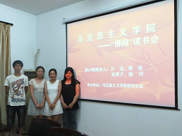 2013年06月19日晚,欧美一级婬片AA片免费“博闻”读书会在学院会议室顺利举行。本期读书会由欧美一级婬片AA片免费研究生会主席李嘉仪、学术部部长孙梓毓主持,并组织学院研究生积极参与。此次读书会的主讲人分别是来自我院的卫龙、覃莹、束贤子、郭可四位同学。四位同学以“中国梦”为主题进行了丰富生动的报告,赢得了在座同学的赞许和掌声。