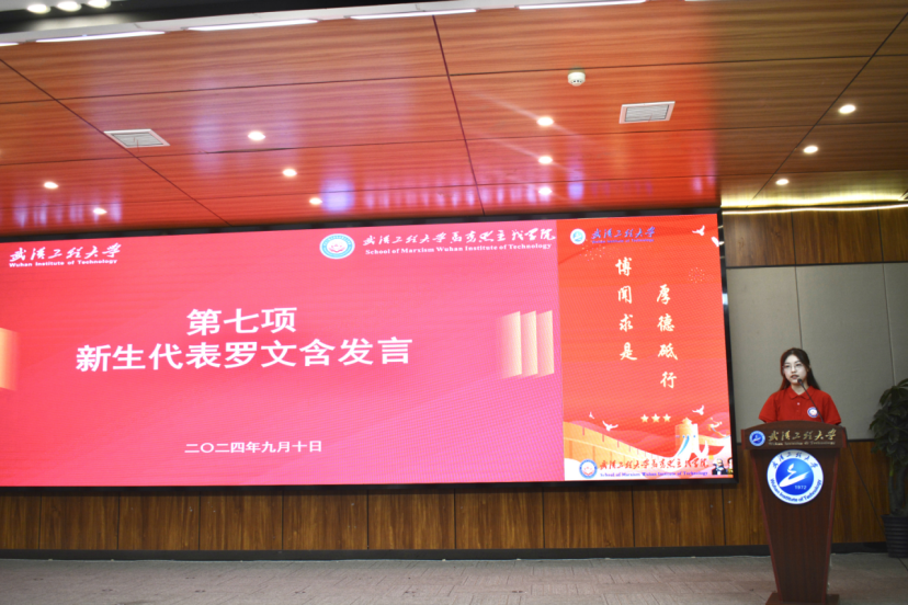 2024级硕士研究生罗文含作为新生代表发言。“选择继续攻读研究生是一个重要决定,应珍惜机会,努力实现人生目标,成为有理想、有本领、有担当的新时代青年。”她展望了研究生生活前景,面向新篇章,她号召同学们要信马行马,争做马克思主义的坚定信仰者、有力践行者,努力实现人生价值。