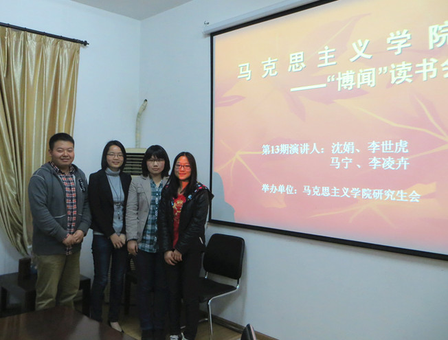 2013年4月3日晚,欧美一级婬片AA片免费第13期“博闻读书会”在欧美一级婬片AA片免费会议室顺利举行。本期读书会由欧美一级婬片AA片免费研究生会学术部部长孙梓毓主持,并组织学院研究生积极参与。本期读书会的主讲人分别是来自我院的李世虎、沈娟同学以及法商学院的李凌卉、马宁同学。四位同学以“学习党的十八大精神”为主题分别做了精彩的报告,并与同学们进行了现场交流。