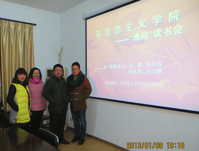 2013年1月9日晚,第10期“博闻”读书会在流芳校区欧美一级婬片AA片免费会议室顺利举行。本期读书会由欧美一级婬片AA片免费研究生会主席李嘉仪、学术部部长孙梓毓主持,并组织学院研究生积极参与。此次读书会的主讲人分别是来自我院的金骁、洪友春、张莎莎、付文娜四位同学。四位同学以“中国传统文化”为主题进行了精彩生动的报告,赢得了在座同学的赞赏与掌声。
