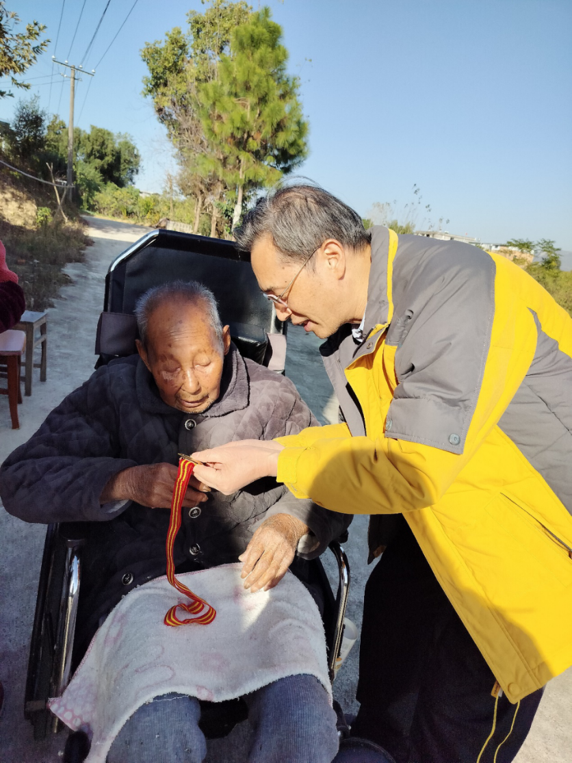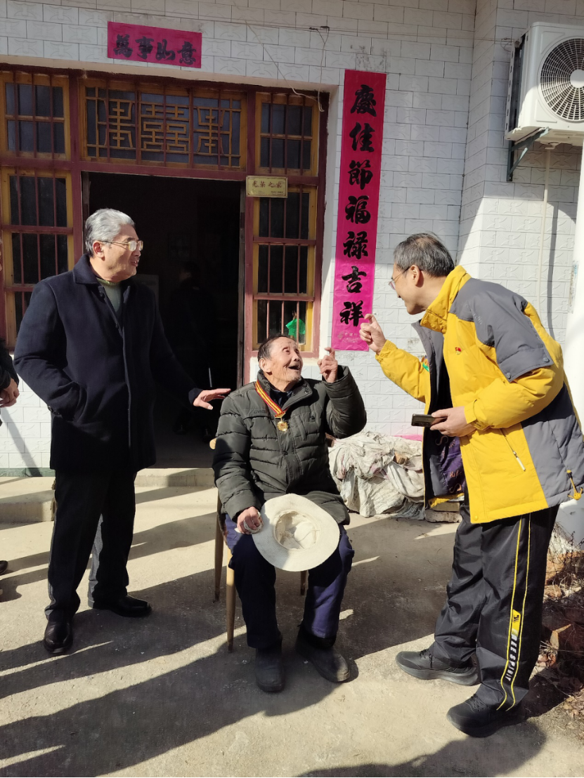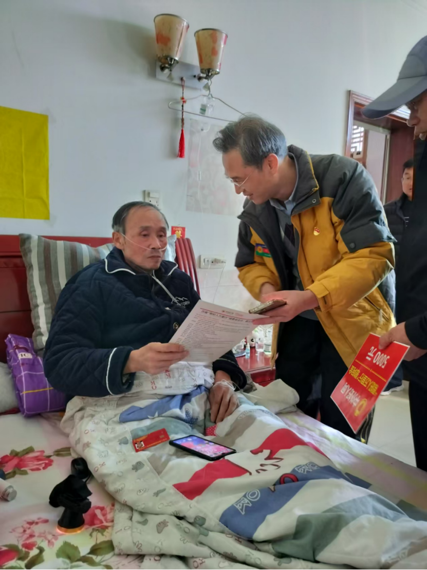 下午,慰问组一行人来到蕲春县刘河镇中路村,对因战致残的抗美援朝退伍老兵丁仁元进行慰问,老人坐在轮椅上向来看望的慰问人员表示感激。