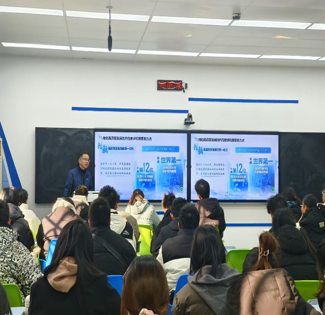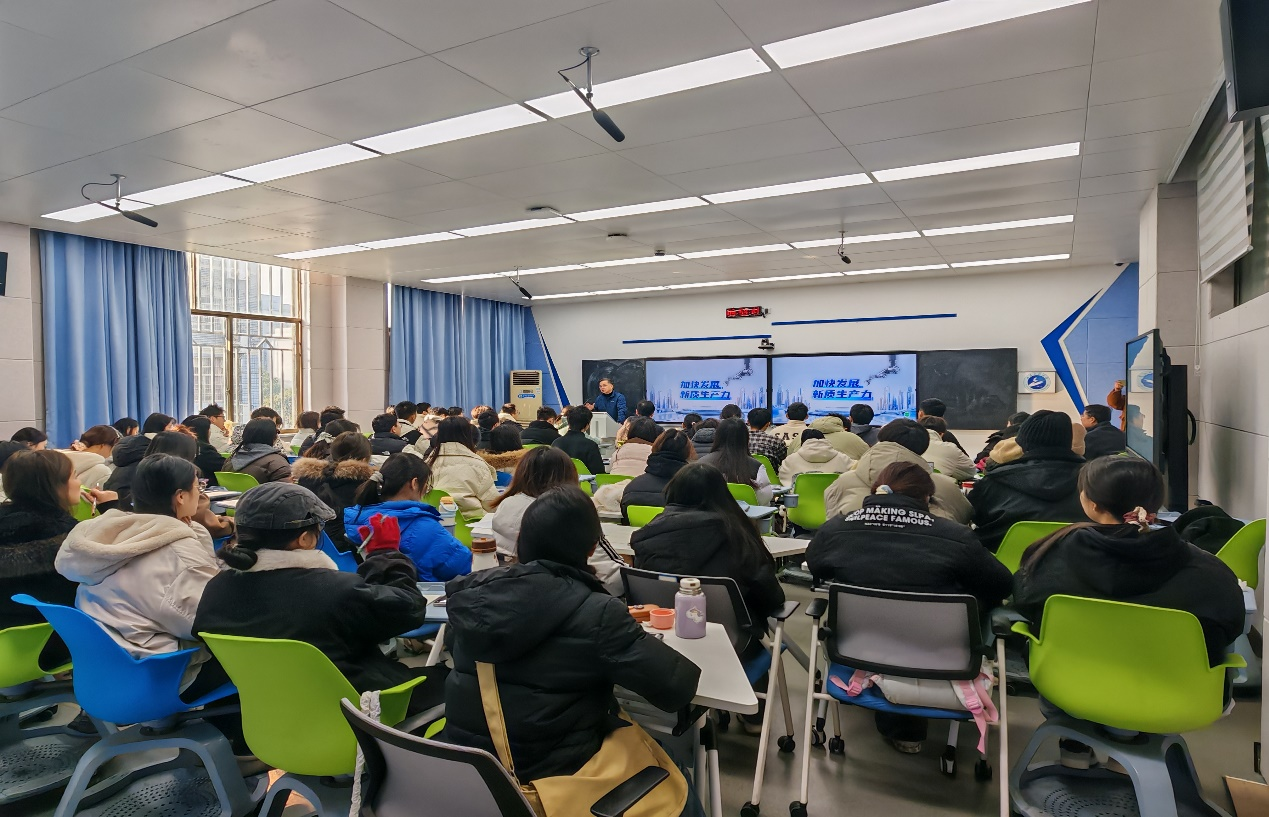 课程伊始,潘书记从当今世界各个发达国家现代化发展的背景出发,深入浅出地给学生们讲解了当今世界发展的趋势以及科学技术对国家现代化发展的重要作用,把学生们的注意力引到课堂当中。潘书记从事关全局的国之大者、创新质优的质态特征、统筹推进的系统工程等方面深入系统讲授了加快发展新质生产力的背景、要求、目标、做法以及作用。