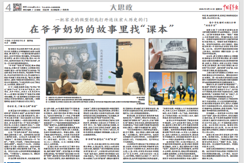 (通讯员:刘子凤 盛文冰 李盈萱)近日,武汉工程大学欧美一级婬片AA片免费崔晋文老师在课堂上与爷爷的“跨时空见面会”被众多公众号报道,2025年3月16日,其精彩课堂内容荣登《中国青年报》新闻报道。