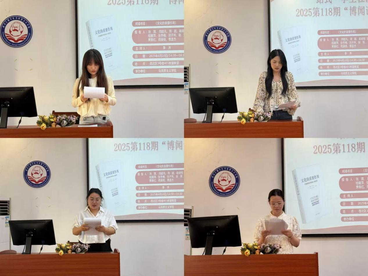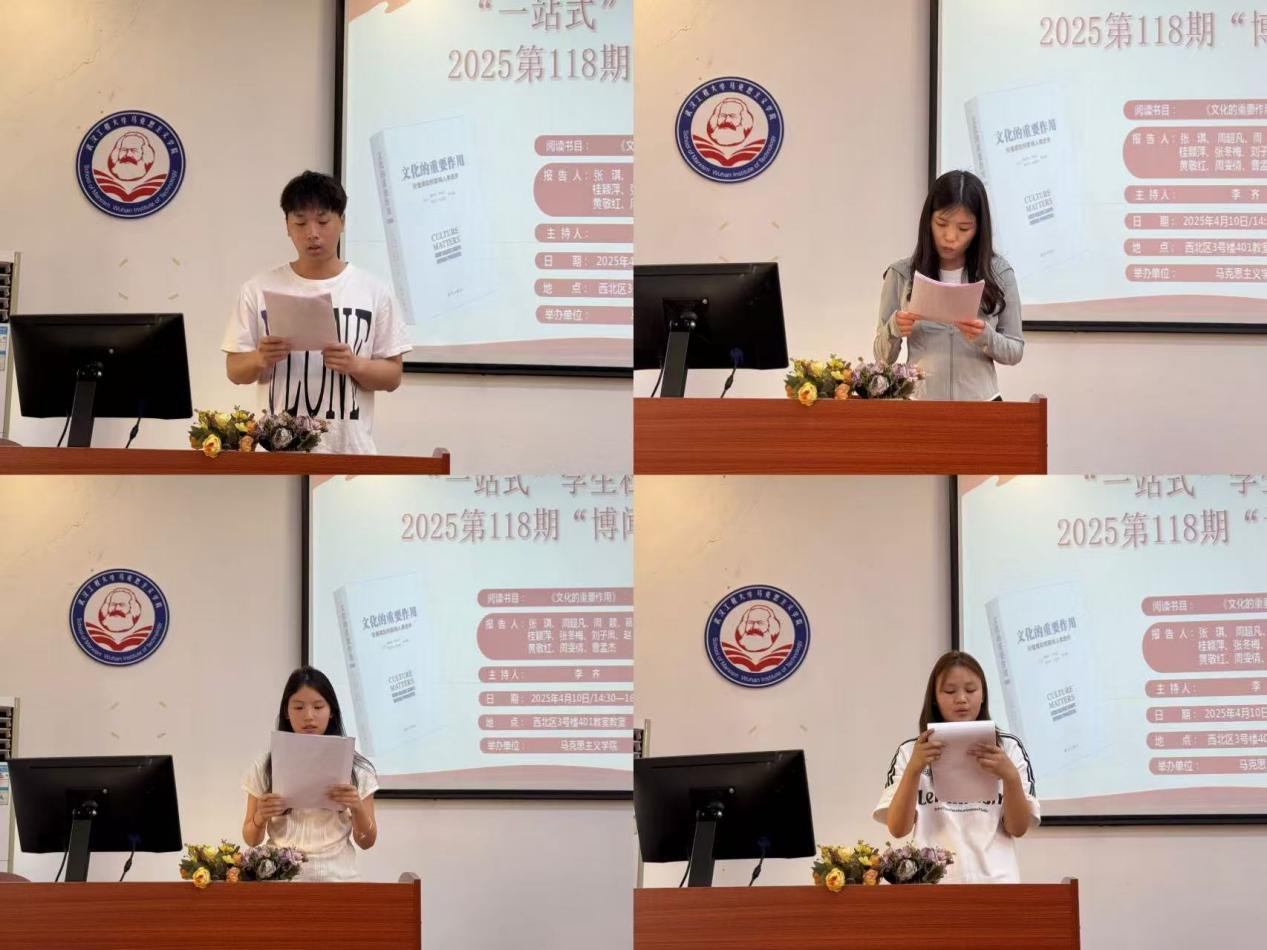 本网讯(通讯员 刘欣 张洋洋)4月10号下午,我院第118期“博闻读书会”在欧美一级婬片AA片免费一站式学生社区中心(求是楼401教室)顺利召开。本次读书会围绕着亨廷顿、哈里森的著作《文化的重要作用》展开讨论。本次读书会由李齐老师主持。参加此次读书会的11位研究生主讲人为24级周雯情、张琪、周颖、周超凡、黄敬红、曹孟杰、刘子凤、张冬梅、葛明悦 、桂颖萍、赵芽。院学术部“博闻读书会”活动小组组织了此次读书会。