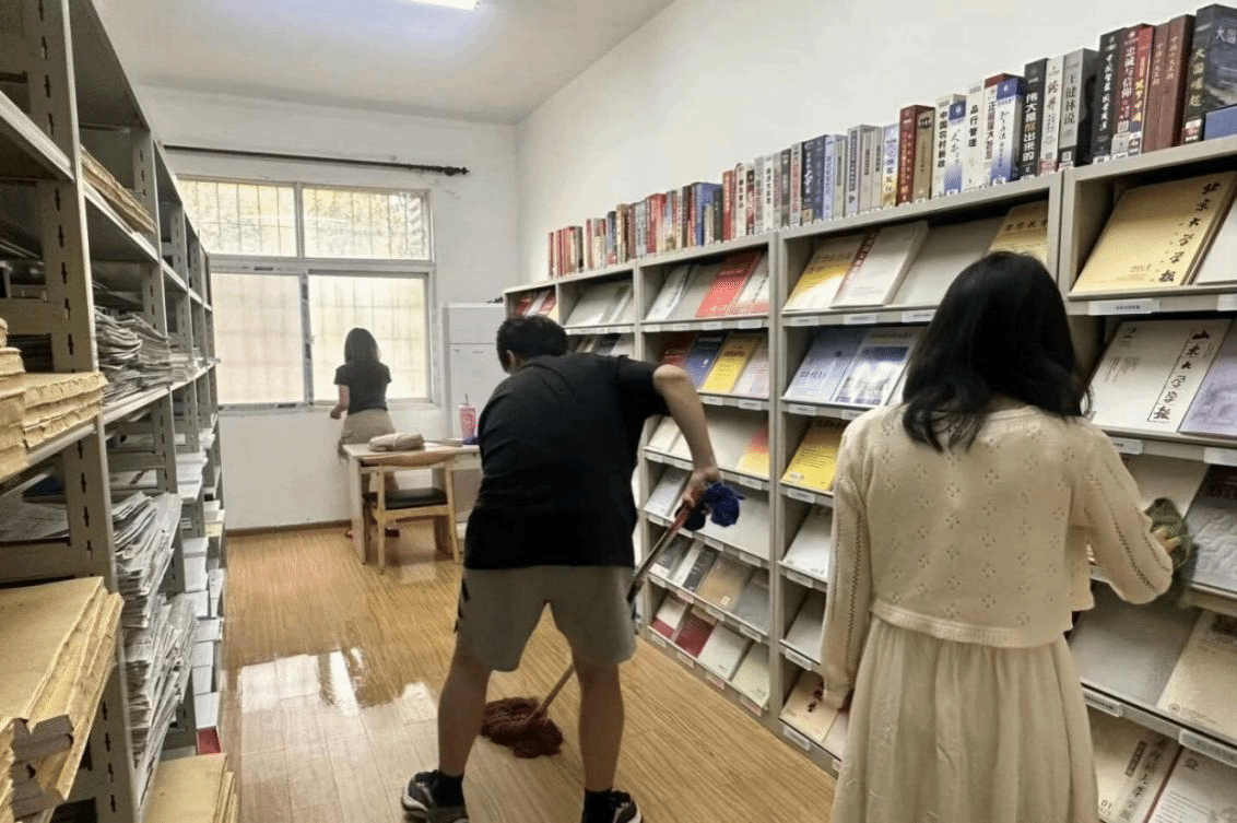 与此同时,发展对象培训班的学员们则来到马院博闻楼,积极参与阅览室书架整理志愿服务工作。他们对书籍进行分类归位,井然有序地整理书架,维护阅览秩序,为读者提供了更加便捷、有序的阅读空间,体现了对知识的尊重和对公共环境的强烈责任感。