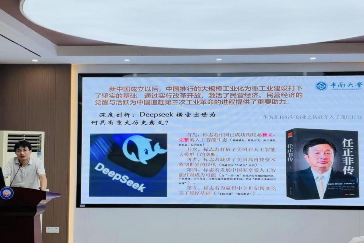 胡腾蛟教授围绕世界之变、时代之变、历史之变与国家发展,从科技革命、国际力量与地缘政治、构建人类命运共同体三个维度展开深入讲解。在科技革命维度,胡教授系统梳理了前三次工业革命的发展脉络:蒸汽时代英国崛起,电气时代德美占据主导,信息时代美国引领全球,生动展现了科技革命对大国兴衰的深远影响。同时,他结合当前AI等科技革新趋势,介绍我国在人工智能生态构建等领域取得的突破性进展,彰显我国打破美国技术垄断、追赶第四次工业革命的决心与实力。