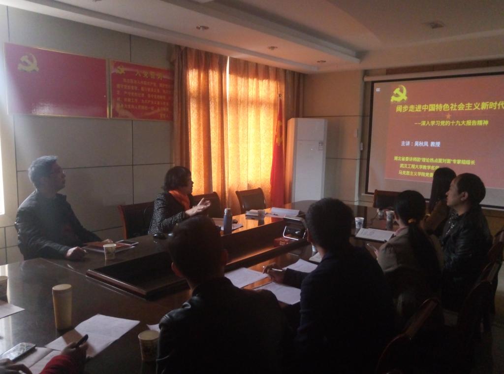 11月10日,应鄂州市鄂城新区之邀,我院党委书记吴秋凤教授、李齐博士、王威博士赴鄂城新区为其培训党的十九大精神基层宣讲团的宣讲员。培训会在鄂城新区管委会二楼会议室举行。会议由鄂城新区党政办主任孟俊青主持,党政办副主任方钢、基层宣讲团的六名宣讲员参加了培训会。