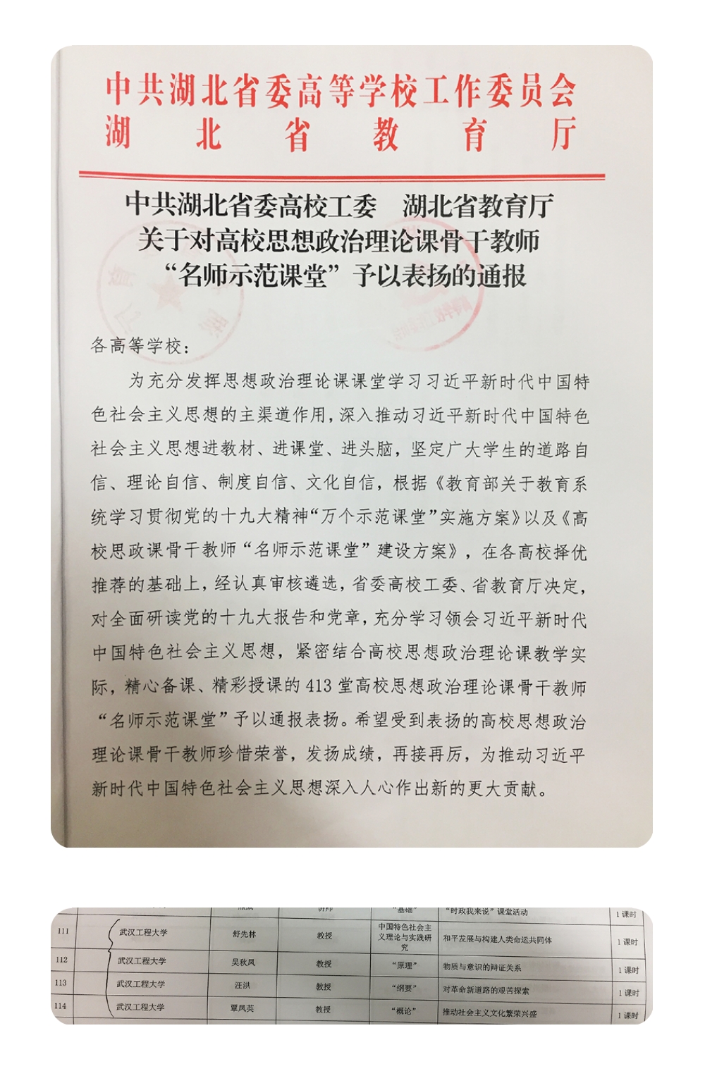 日前,中共湖北省委高校工委、湖北省教育厅印发了《关于对高校思想政治理论课骨干教师“名师示范课堂”予以表扬的通报》,我院有4位教师讲授的4堂课成功入选“名师示范课堂”并受到表彰。它们分别是:舒先林教授讲授的《和平发展与构建人类命运共同体》、吴秋凤教授讲授的《物质与意识的辩证关系》、汪洪教授讲授的《对革命新道路的艰苦探索》、覃凤英教授讲授的《推动社会主义文化繁荣兴盛》。