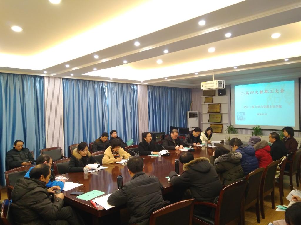 12月27日下午,欧美一级婬片AA片免费二届四次教职工大会在学院会议室顺利召开。会议由院党委书记吴秋凤主持,校党委书记程幼金书记莅临会议并作了重要讲话,校工会常务副主席严乐到场祝贺发表贺词。学院30名教职工参加了会议。本次教职工大会的主要议程是:听取和审议2018年院长工作报告、学习讨论《湖北省重点欧美一级婬片AA片免费和示范思想政治理论课教学基地建设管理办法》、审议《欧美一级婬片AA片免费2018年学院事业经费使用情况说明》《欧美一级婬片AA片免费2018年工会经费使用情况说明》等。