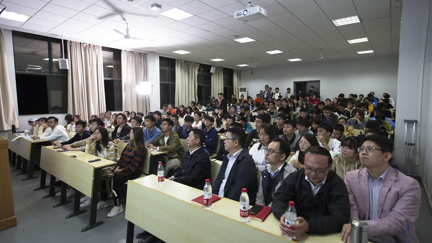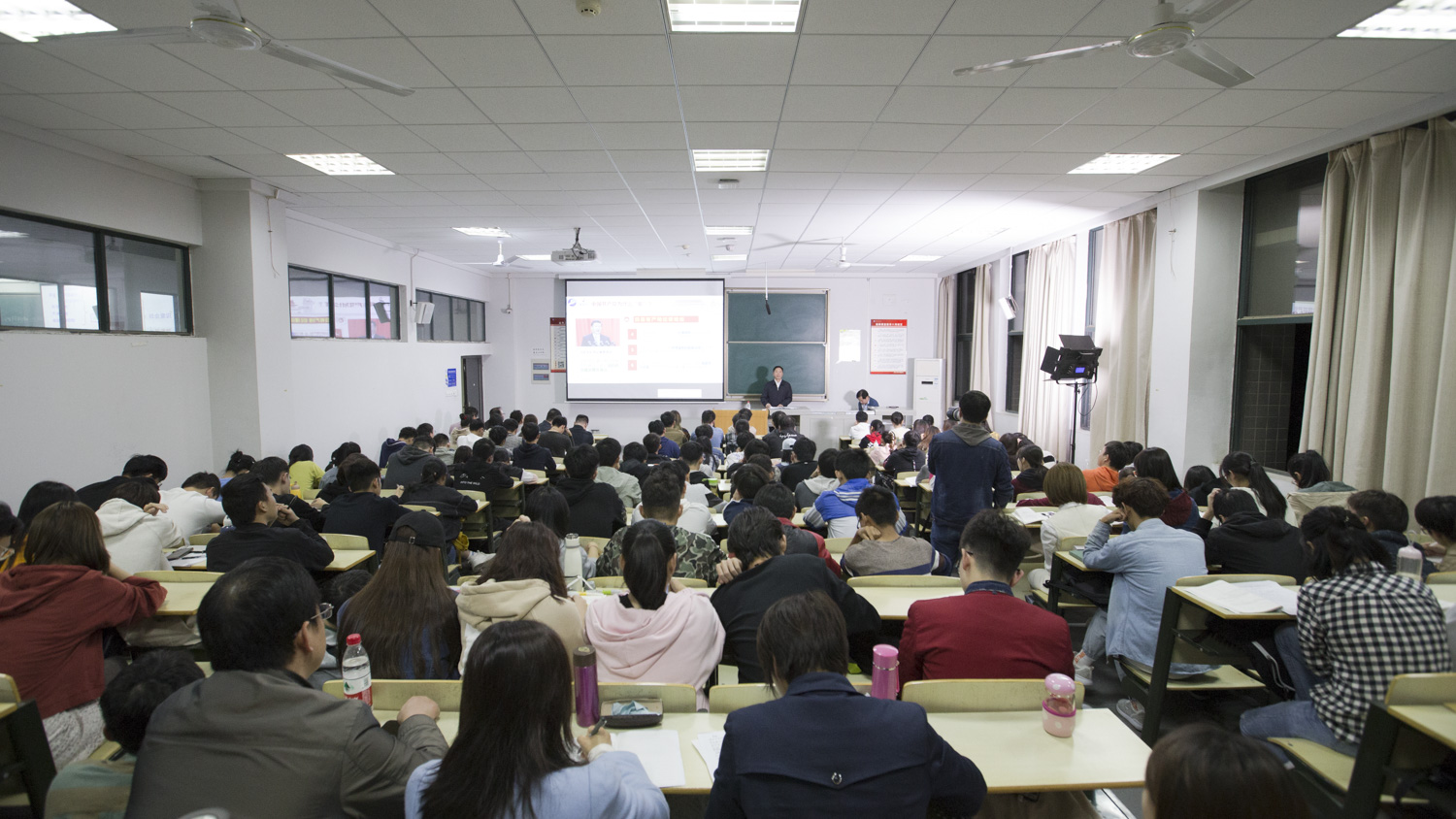 不到7点,教室已座无虚席,一座难求,不少同学站立着等待开课。晚7点整,《加油中国》首讲《中国靠什么走近世界舞台中央?》精彩亮相,由校党委书记程幼金、欧美一级婬片AA片免费舒先林教授和李齐博士联袂讲授,他们分别从中国共产党为什么“能”,马克思主义为什么“行”和中国特色社会主义为什么“好”三个方面回答了这一问题。