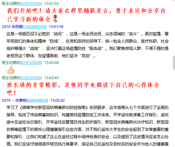 2019级班主任颜欣:大家的学习心得都非常精彩!有态度、有高度、有深度、更有温度!新冠疫情发生以来,习近平总书记在不同场合作出了重要指示,为我们打赢疫情防控阻击战提供了方向和根本遵循。中华民族自古以来就有同舟共济的优良传统,从1998年的抗洪抢险到2008年的汶川地震,再到现在的新冠肺炎疫情,中华民族始终万众一心、众志成城、守望相助。我们党员要继续增强“四个意识”、坚定“四个自信”、做到“两个维护”,不忘初心、牢记使命,切实把思想和行动统一到总书记重要指示精神上来。习近平总书记关于疫情防控工作的系列讲话精神给武汉人民、湖北人民、全国人民以巨大的激励和鼓舞,也为世界抗疫工作提供了中国智慧和中国经验。在这万物复苏的春天,武汉的抗疫斗争取得了突破性的进展,胜利的曙光就在眼前!为确保来之不易的成果,我们还有很多工作去做,比如:我们在长时间内要养成良好的卫生习惯和防范意识,没事不要去人多的地方扎堆,勤洗手,做好高等学校新型冠状病毒肺炎防控工作,全力配合国家打好疫情狙击战!