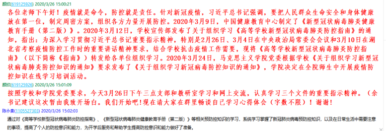 2020年3月26日(周四)下午,“纲要”党支部书记施亚利在“红太阳—武工大纲要党支部”QQ群上,布置了学习任务,要求各成员按照马院“学习防控知识通知”要求,重点学习了《手册》、《指南》。截至3月28日晚,“纲要”党支部各位成员经过认真学习,撰写了学习的心得体会,并提交给支部书记。