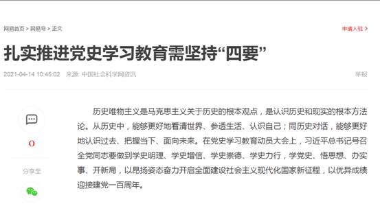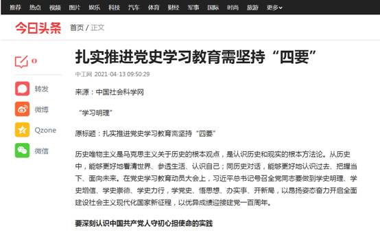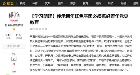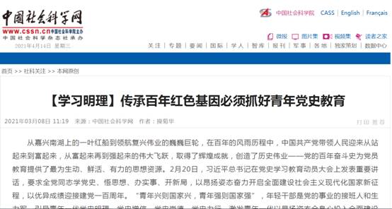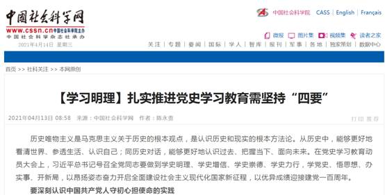(通讯员 金诗灿)中共中央决定开展党史学习教育主题活动以来,我校欧美一级婬片AA片免费迅速响应党中央号召,按照学校部署,积极组织教师开展党史教育专题学习活动,组织教师撰写文章,深入研究党史及如何开展党史教育,在《中国社会科学网》等多家主流网站发表文章。操菊华教授撰写了《传承百年红色基因必须抓好青年党史教育》(http://ex.cssn.cn/zx/bwyc/202103/t20210308_5316182.shtml),陈永贵博士撰写了《扎实推进党史学习教育需坚持“四要”》(http://ex.cssn.cn/zx/bwyc/202104/t20210413_5325923.shtml)。文章发表后,被搜狐、网易、中国历史研究网及今日头条等客户端转发,产生了积极影响。
