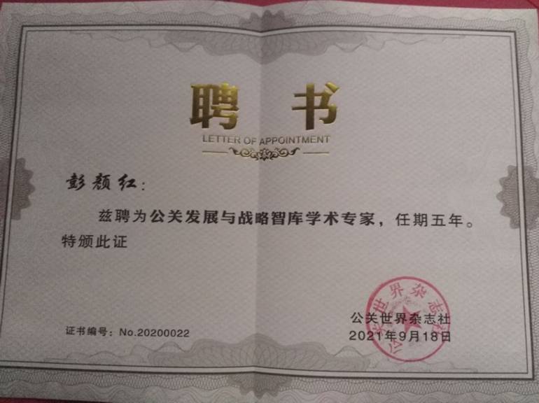 (通讯员蔡明广)近日,《公关世界》给马院副教授彭颜红博士发来聘书,聘请彭颜红博士为公关发展与战略智库学术专家。