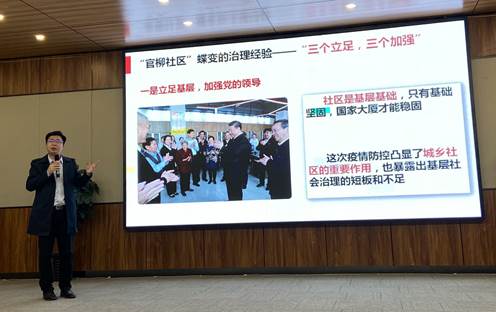 王威博士首先给同学们讲述了官柳社区蝶变的故事。官柳社区作为国有企业鄂城钢铁公司的家属区,在治理前存在着三个突出问题:社区治安问题;邻里关系不和谐;环境治理问题。长此以往,这些问题演变成了思想认识、管理能力和居民素质等方面的历史遗留问题,给官柳社区治理带来了重重困难。为了改变官柳社区“脏乱差”的面貌,社区工作人员发动居民群众,依次进行了房屋漏水治理和违建治理,创立了帮扶独居老人的红丝带行动,使得居民参与社区治理意识不断提升,社区生活环境不断改善,现在的官柳社区已经成为了成功治理的典范。