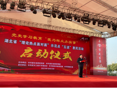 (通讯员黄小倩)10月23日上午,中共湖北省委宣传部、省委讲师团在鄂州市凤凰广场举行全省“理论热点面对面”示范点“五送”惠民活动启动仪式。出席今天启动仪式的有湖北省委宣传部、湖北省委讲师团、湖北省教育厅、鄂州市委、鄂城区委等有关部门领导,武汉工程大学等参与高校及示范点所在市州县(市、区)领导和专家。
