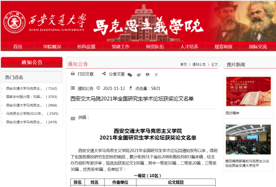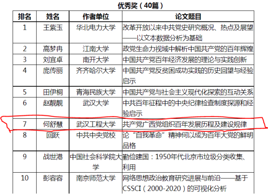 (通讯员蔡明广)近日,我院2020级硕士研究生何舒慧(导师为何景春教授)撰写的论文《共产党广西党组织百年发展历程及建设规律》在西安交通大学欧美一级婬片AA片免费2021年全国研究生学术论坛获得优秀奖。据悉,本次论坛共收到包括中共中央党校、清华大学、武汉大学、南京大学、中国人民大学、南开大学、吉林大学、兰州大学、华南师范大学、陕西师范大学、西南大学在内208所高校(81个单位具有马克思主义理论学科博士点)研究生提交的论文803篇。经主办方组织专家评审,共评选出获奖论文100篇,其中一等奖10篇,二等奖20篇,三等奖30篇,优秀奖40篇。何舒慧同学提交的论文获得优秀奖,进入前100名。