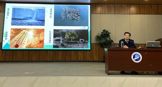 为了让学生能够听懂碳排放导致全球气候变化的危机,曹胜亮讲到,“2020年全球平均气温比工业化前上升了大约1.2℃”。为了让学生能够认识到“1.2℃”对于全球气候的影响,曹胜亮起身示范、声情并茂,“全球平均气温每升高1℃,海平面可能会上升超过2米,大家看,我还不到2米。随着气温进一步升高,许多美丽的家园如夏威夷、马尔代夫等地都有可能被淹没,大家抓紧去这些地方看看吧。”此刻,全场响起了热烈的掌声。