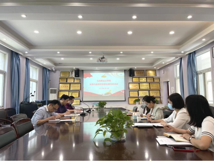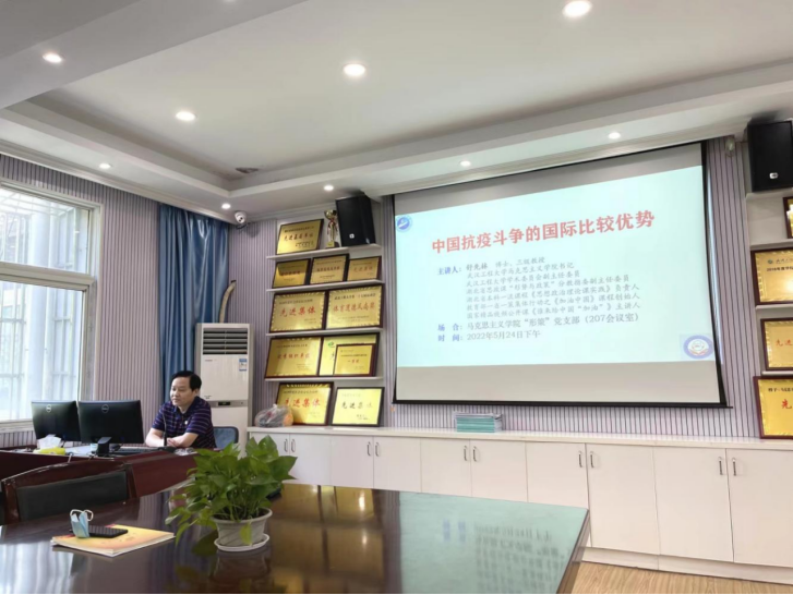 (通讯员陈永贵)5月24日下午,“形策”党支部主题党日活动在欧美一级婬片AA片免费二楼会议室举行。院党委书记舒先林作为特邀代表出席活动并讲授《中国抗疫斗争的国际比较优势》微党课,院党委副书记、副院长(兼)陈俊作为学院联系“形策”党支部领导参加活动。本次活动由“形策”党支部书记陈永贵主持。