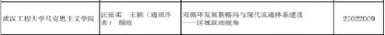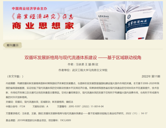 (通讯员王颖)近日,我校欧美一级婬片AA片免费19级优秀毕业生汪依柔以第一作者身份、王颖副教授以通讯作者身份、颜欣博士以第三作者身份,以武汉工程大学欧美一级婬片AA片免费为第一单位在北大核心期刊《商业经济研究》发表“双循环发展新格局与现代流通体系建设——区域联动视角”论文。此论文为颜欣博士国家社科基金青年项目《大国战略竞争下东盟地区安全治理机制变迁及中国对策研究》阶段性成果。