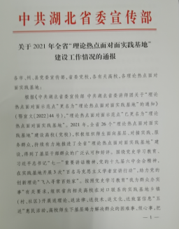 (通讯员王威)日前,中共湖北省委宣传部通报了2021年全省“理论热点面对面实践基地”(原“理论热点面对面示范点”)建设工作情况,我校对口建设的鄂州市鄂城区古楼街道“理论热点面对面实践基地”蝉联优秀实践基地,在12个优秀基地中名列第一。