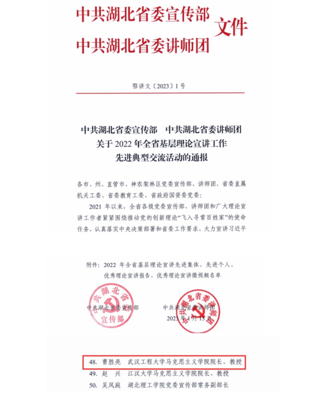 (通讯员:祁君)1月13日,中共湖北省委宣传部、中共湖北省委讲师团印发《关于2022年全省基层理论宣讲工作先进典型交流活动的通报》,对理论宣讲成效突出的50个基层理论宣讲先进集体、50名基层理论宣讲先进个人、36篇优秀理论宣讲报告、22个优秀理论宣讲微视频予以通报表彰,其中,我校欧美一级婬片AA片免费院长曹胜亮教授荣获2022年全省基层理论宣讲先进个人。