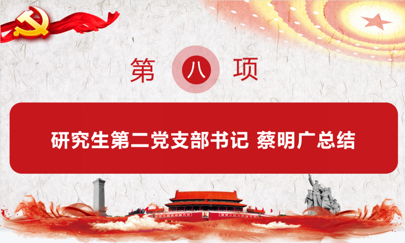 会议最后,蔡明广老师作总结发言。他首先向全体党员同志致以新年的诚挚问候!他寄语全体党员同志:一是要珍惜支部主题党日活动的学习机会,充分准备,积极交流;二是新的一年新气象,亦是新起点,希望大家珍惜假期时光,加强理论学习,武装头脑;三是党员同志要加强党性修养,真正做到吃苦在前,享受在后,发挥好先锋模范带头作用。