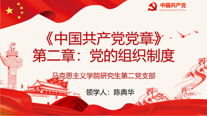 活动第一项,全体起立,奏唱国歌。随后,在史晨旸同志的带领下重温入党誓词,强化党员讲党性、重品行、作表率意识。陈典华同志带领全体党员学习《中国共产党章程》第二章《党的组织制度》部分,他围绕民主集中制的六项基本原则详细讲解了党的组织制度的重要意义。通过领学,在党员同志队伍中逐渐掀起了学习党章、遵守党章、贯彻党章、维护党章的浪潮,认真把党章精神落实到工作和学习当中。