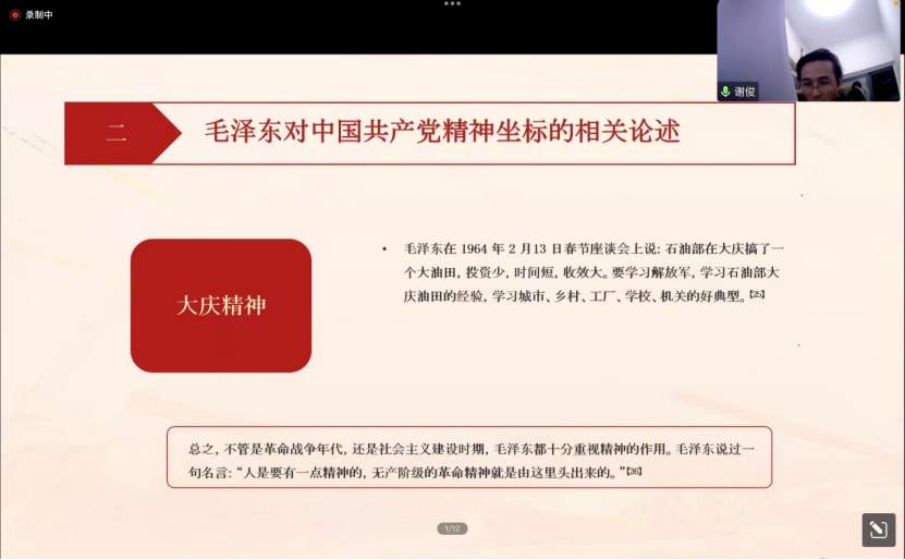 随后,谢俊老师向同学们详细讲述了“毛泽东对中国共产党精神坐标的相关论述”,展示了毛泽东同志崇高的共产主义精神信仰。谢老师阐释了中国共产党的精神优势。一百年来一直延续至今,是一脉相承且客观的,并不断发展的。多角度的剖析了“毛泽东对中国共产党精神谱系培育形成发展的作用”和“毛泽东对中国共产党精神塑造的思考”。中国共产党的伟大精神谱系,是由一个个鲜明具体的“坐标”组成。无论时代怎么变迁,伟人的思想永远值得我们学习,新时代的我们也需要从这种精神中汲取奋斗力量。