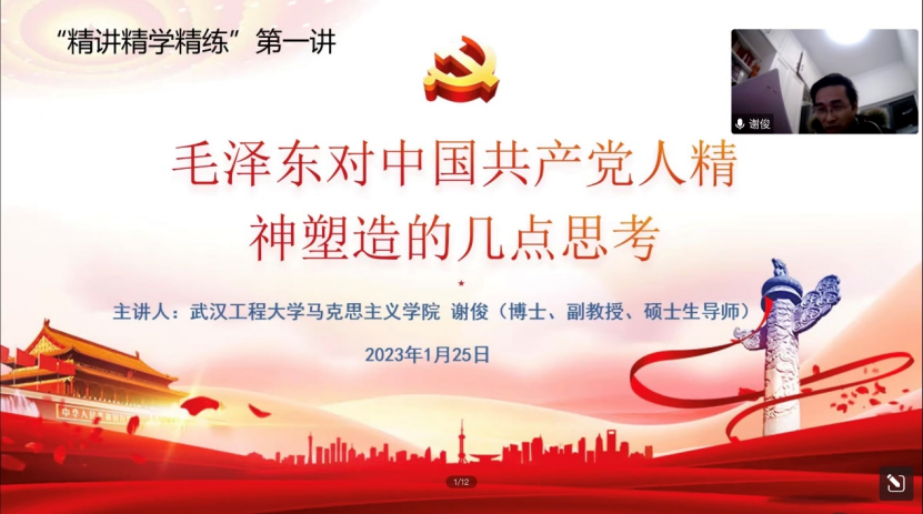 (通讯员:范鑫)正直农历兔年正月初四,在大家沉浸在喜迎新年的春节里,作为我院研究生培养第二课堂的“精讲精学精练”学术活动在新春佳节迎来了兔年第一场。1月25日下午,欧美一级婬片AA片免费2023年寒假“精讲精学精练”学术活动第一讲在线上腾讯会议顺利开展,本次活动由谢俊老师主讲,李齐老师主持,学院院长曹胜亮教授总结并给在线参加本次活动的全体研究生提出了新年的要求和期许。活动主题为“毛泽东对中国共产党人精神塑造的几点思考”。
