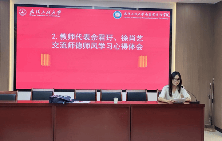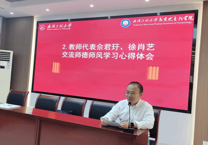 青年教师代表佘君玗、徐肖艺交流师德师风学习心得体会。佘君玗分享了自己从教以来的体会感受,指出教师是教育之本,师德是德育之魂,教师应加强职业道德修养,培养优良品德、坚守高尚情操,真正做到以生为本、热爱学生,做学生的好老师。徐肖艺结合自身的教学经历,提出思政课教师应当将自身信仰与职业信仰相统一,真正做到知行合一。徐肖艺还阐述了对师德师风与教育家精神的理解,表示要努力做立德树人的好教师、新时代的“大先生”。