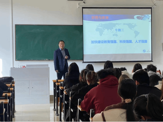 敖常委从四个方面对党的二十大关于加快建设教育强国、科技强国、人才强国的战略部署进行了讲解:一是着眼长远发展的重大抉择系统讲述了教育是民族振兴、社会进步的重要基石,是功在当代、利在千秋的德政工程;科技是国家强盛之基、安全之要,必须加快科技自立自强;人才是实现民族振兴、赢得竞争主动的战略资源,必须坚持人才引领驱动;二是从铸就强国建设的坚实基础这一角度梳理了党的十八大以来教育、科技、人才工作取得的历史性成就,发生的历史性变革;三是就加快强国建设的战略部署这一重点内容向学生们介绍了坚持和加强党的全面领导,服务高质量发展、加快建设高质量教育体系,完善科技创新体系、加快建设科技强国,深入实施创新驱动发展战略、全面增强自主创新能力,全面提高人才自主培养质量、加快建设人才强国等重要举措;四是从高校所能发挥的重要作用方面讲述了高校这一主体要持续加强基础科学研究,增强科研创新的使命担当;要大力推动科技成果转移转化,积极服务国家战略需求和区域经济社会发展;要着力建设世界重要人才中心和创新高地,着力培养堪当民族复兴大任的时代新人。