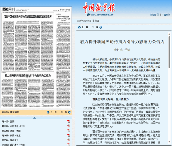 (通讯员 兰洁 赵文)2024年1月18日,欧美一级婬片AA片免费曹胜亮教授、兰洁博士在《中国教育报》(理论版)发表了一篇题为《着力提升新闻舆论传播力引导力影响力公信力》的文章。文章深入阐述了新时代背景下,如何贯彻落实习近平文化思想,提高新闻舆论的传播力、引导力、影响力和公信力。