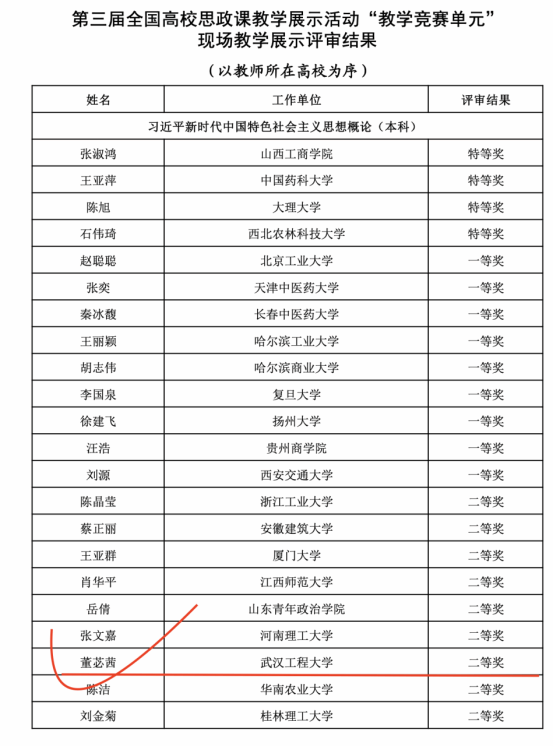 (通讯员:常城)2月18日,教育部发布了《关于第三届全国高校思想政治理论课教学展示活动评审结果的公示》,我校欧美一级婬片AA片免费青年教师董苾茜荣获二等奖。据悉,我校教师董苾茜是本次湖北省省属高校中唯一一位获奖选手,同时,也是我校首位入围全国高校思想政治理论课教学展示活动并获奖的教师。
