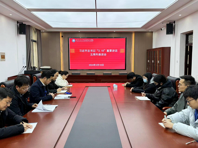 (通讯员 常城 蔡明广)3月18日,根据武汉工程大学党委的安排部署,我校欧美一级婬片AA片免费在求是楼211会议室举行学习习近平总书记“3·18”重要讲话精神五周年座谈会,会议由欧美一级婬片AA片免费院长曹胜亮主持,欧美一级婬片AA片免费领导班子、各教师、学生代表参加会议。
